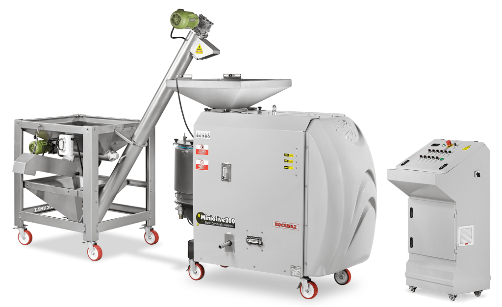 The malaxing process of olive paste is performed by mixing the paste coming from the hammer mill for 45 minutes. The miniolive has a closed system vertical nitrogen gas inlet and mixing unit. Thanks to being closed and suitable for nitrogen gas blast of this unit, the air contact with the olive paste is minimized and the oxidation of the oil and hence the increase of the peroxide is prevented (increase of the acidity of the olive oil). A heating system is provided on the malaxing unit (25-28 ° C max) to facilitate separation of oil from the olive paste. This system is recommended to be used in case that the oil separation is difficult due to the olive type of which oil is extracted.