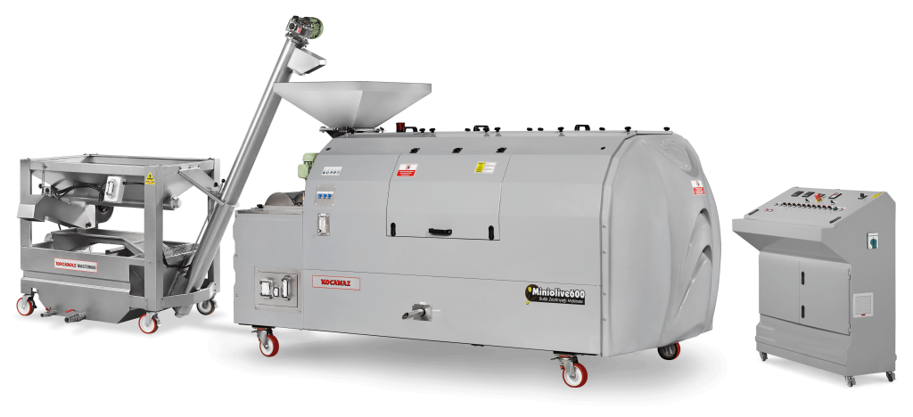 The operation of the system is similar to other Master Series washing units. Water is filled into the water circulation pump and the unit is prepared for operation. The collected olives are put on the top bunker of the machine, the olives are discharged into the lower bunker of the machine through the adjustable-speed screw conveyor for olives. After the olives fall into the lower bunker, leaves and pieces of branches among them are thrown out of the system by means of a fan. Stones or foreign bodies that have blended in the system are stored in a separate area and manually thrown out of the system from here. Cleaning water of Master 600 model units is replaced at certain intervals.
