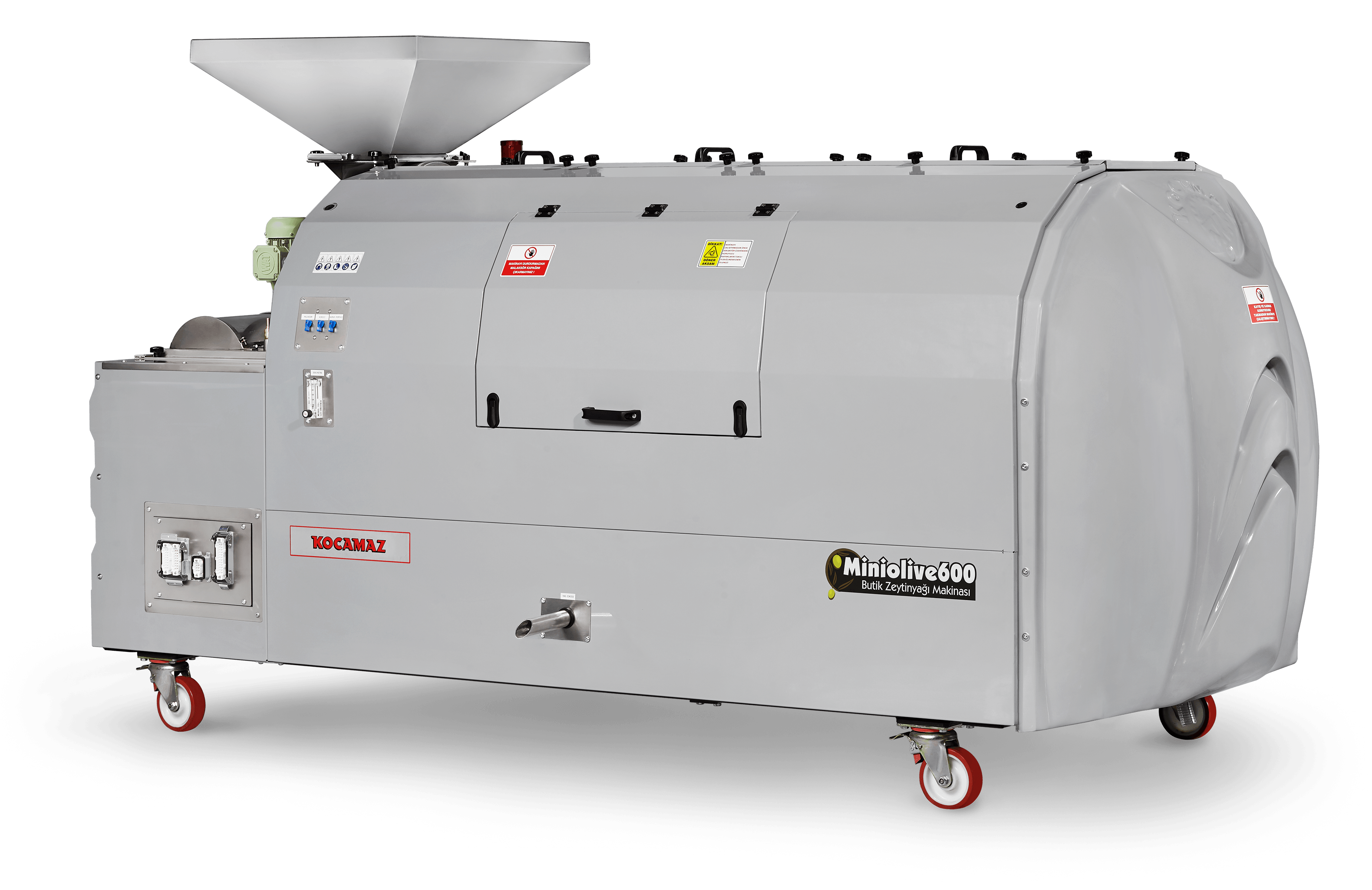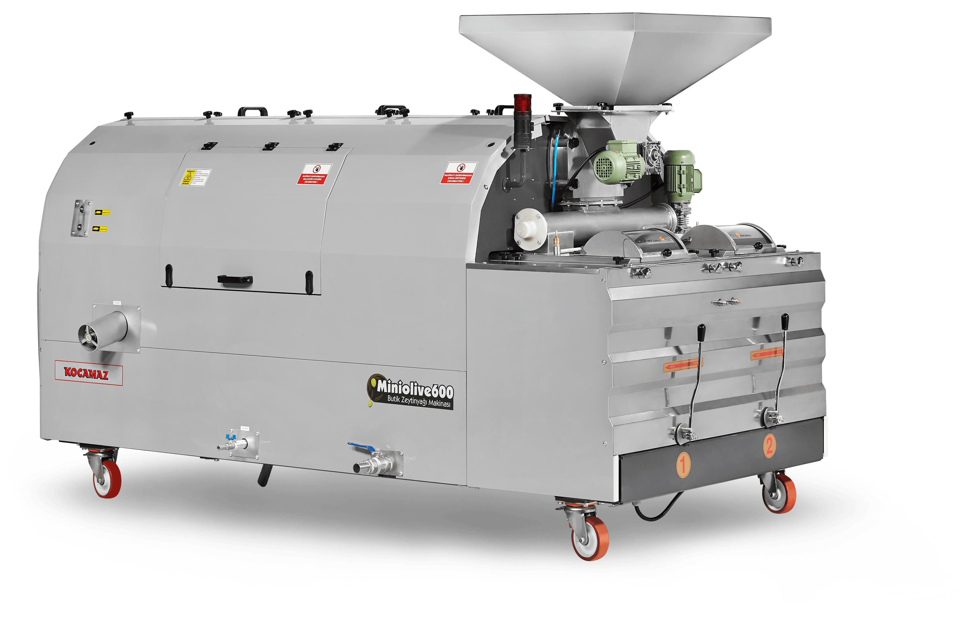 It is a model preferred by large-scale boutique olive oil producers. Operated with auxiliary machinery and equipment, it enables you to reach high production capacities in limited production locations. Miniolive 600 series machines have the capacity to process 550-600 kg of olive paste per hour. Its double malaxator structure enables olives of different types and sizes to be simultaneously processed in separate malaxators reducing waiting times, thus it enables the olives of different types and sizes to be processed faster. The cycloid gear box system in the machine gives the decanter more strength and enables it to work more quietly.